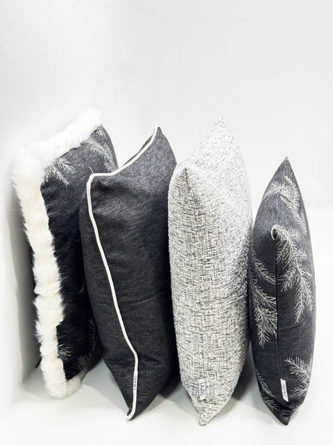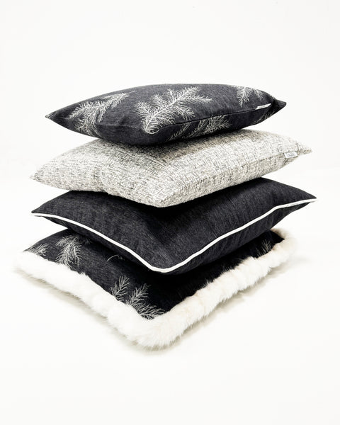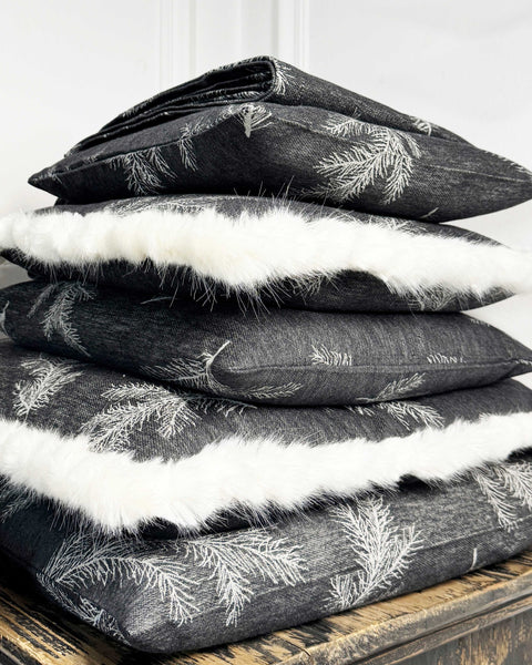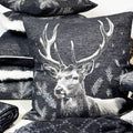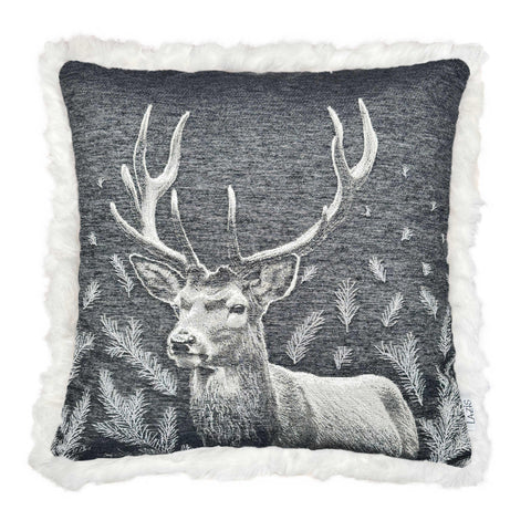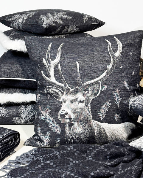 PFLEGEHINWEISE -30 Grad waschbar FARBE - schwarz-creme-grau DETAILS -Gewebtes Hirschdesign mit Tannenzweigen Fond schwarz |